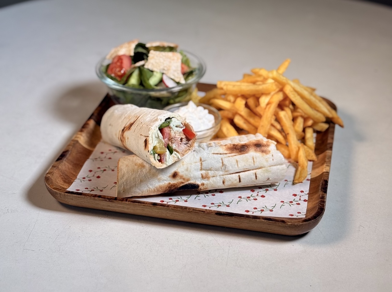 كفتة مشوية بخبز التورتيا مع بطاطا مقلية وصلصة لبن